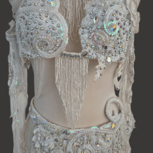חליפת ריקוד מקצועית ויוקרתית בעבודת יד בשילוב פרנזים, חרוזים, פאייטים ותחרה.