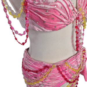 סט מרהיב של חזייה וחגורה לאגן, עשויים מבד קטיפה יוקרתי ומעוטרים בשרשראות זוהרות.